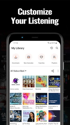 Users can create custom playlists with their favorite podcast episodes. This makes it easy to organize content and keep track of related episodes.